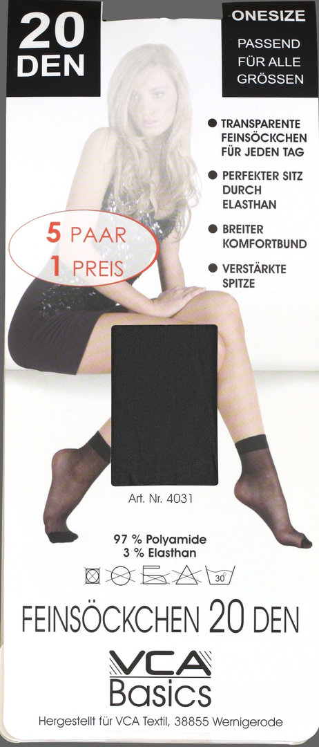 20 DEN Feinsöckchen in matter Optik | optimale Passform und faltenfreier Sitz durch den Elasthananteil | sehr langlebig durch die verstärkte Spitze | der komfortable und elastische Bund sorgt für ein angenehmes Tragegefühl | Komfortnähte verhindern unangenehme Druckstellen | super weich | sehr hochwertig gearbeitet | diese Socken sind absolute Standards für jede Frau | eingeschweißte 5er Packung mit Foto-Einleger
