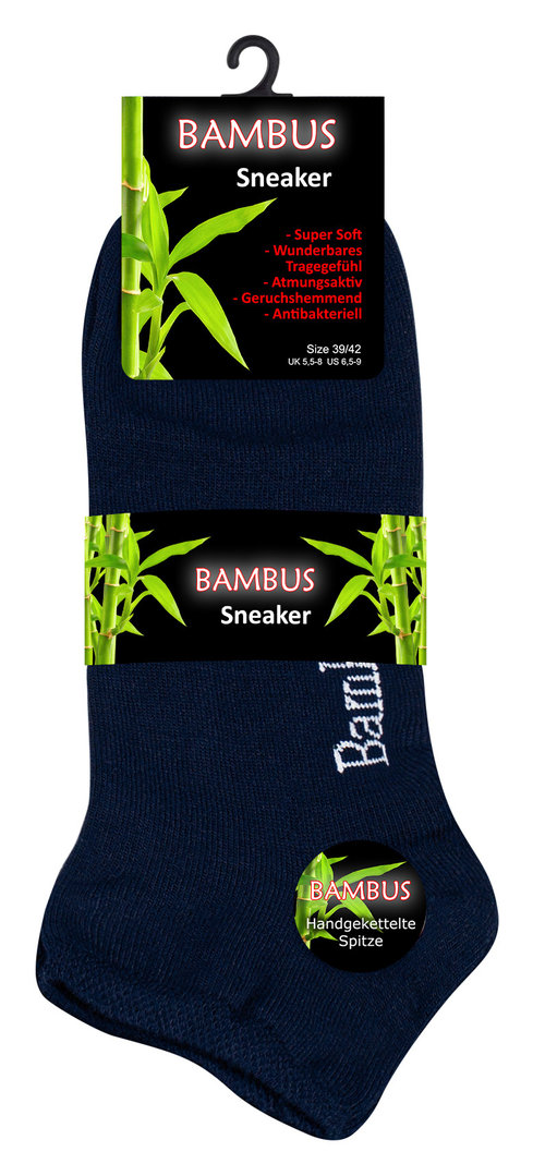 SUPER WEICHE und leichte Sneakersocken | handgekettelte Spitze - keine spürbare Naht an den Zehen | der Softbund verhindert unangenehme Druckstellen | geruchshemmend | faltenfreie und perfekte Passform durch den Elasthananteil | durch die natürliche Wechselwirkung der Bambusviskose, sorgen diese Socken immer für ein ausgewogenes Fussklima | lange Haltbarkeit durch die verstärkte Spitze und Ferse | unifarbene Sneaker mit "Bambus" und Größen-Schriftzug auf der Sohle