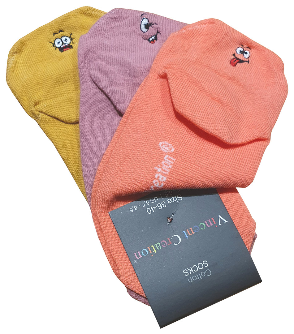 Vincent Creation® Damen Sneaker Socken mit Fersenlasche und lustiger Stickerei im 3er Pack